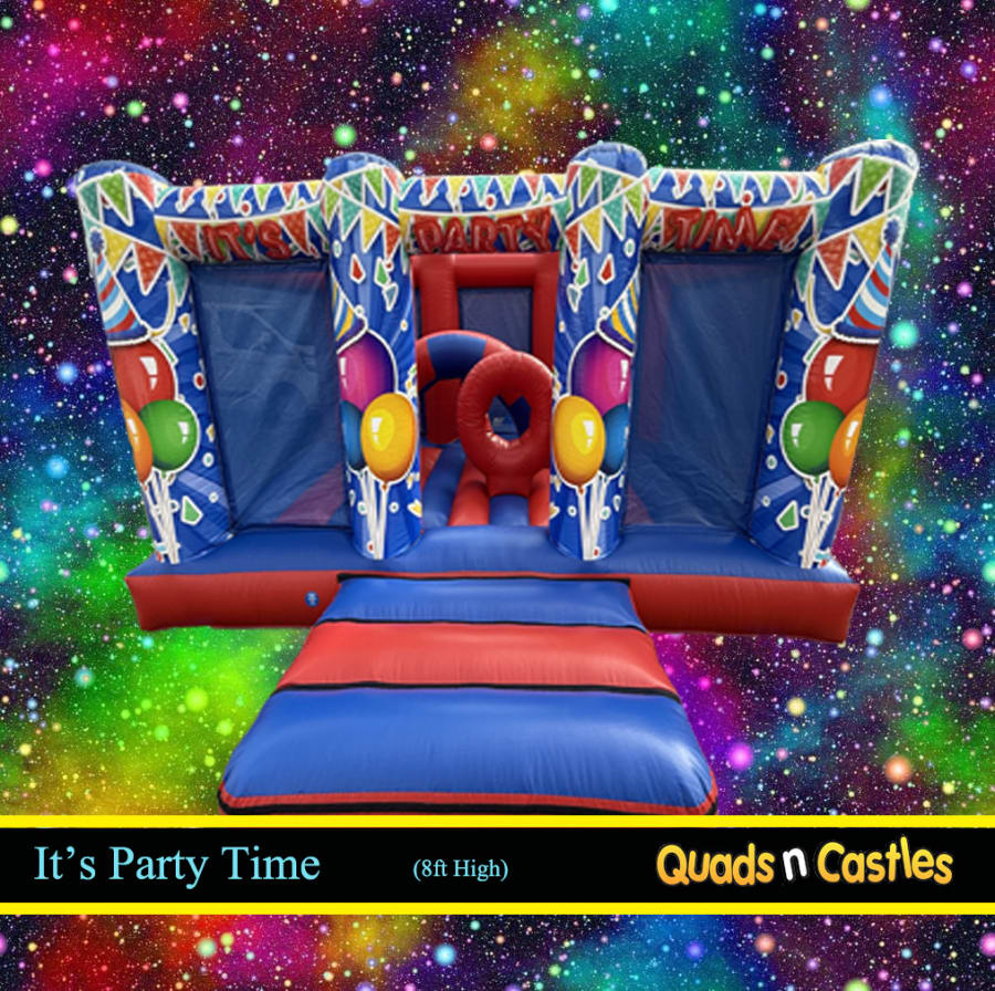 It's Party Time is a compact, low height bouncy castle built for halls and venues with low ceilings. It delivers big fun in a small footprint. Perfect for younger explorers, this castle features two built-in obstacles designed for climbing through, over and around. Safe. Durable. Crowd-pleasing. π